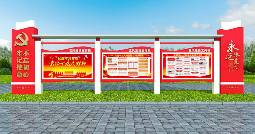 黨建文化宣傳欄是一種近年來流行在城鎮(zhèn),鄉(xiāng)村,市政,社區(qū)等公共資源大院的標(biāo)志性愛國愛黨政治產(chǎn)物,我們看到黨建兩個字就可以聯(lián)想到這是為宣傳,為公示,為思想建設(shè)的標(biāo)識牌,豎立在市政大院或廣場一偶,便有了黨與人民心結(jié)相同的聯(lián)姻。這里黨建文化標(biāo)識或是社會主義價值觀標(biāo)識引人注目,宣傳作用效果顯著。讓往來人群感受有所不同的實(shí)時訊息及黨政教育和思想的傳達(dá)。